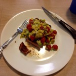 One if my favorite kinds of meals: summer vegetables front and center! Summer squash, zucchini and onions, purple hull peas, hard boiled eggs from our own chickens, tomatoes from our garden plus blackberry jello made from real blackberries we picked!